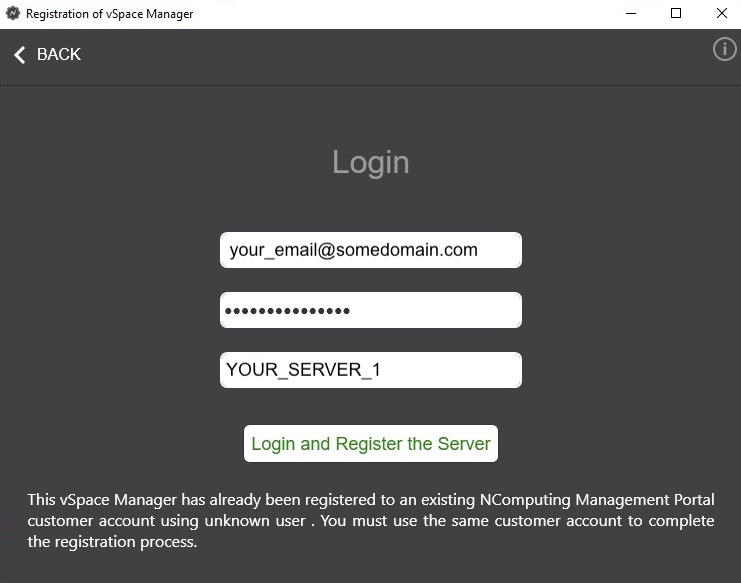 1. A secondary Management Portal account is bering used to attempt to register. An NComputing / Management Portal account, works as a central place where all your servers and terminals register to. You cannot use more than one account. Therefore, when you register a server after reinstalling our software, you must do so in the original account that it was registered with. If you move attempt to register with another account you will get a similar error.