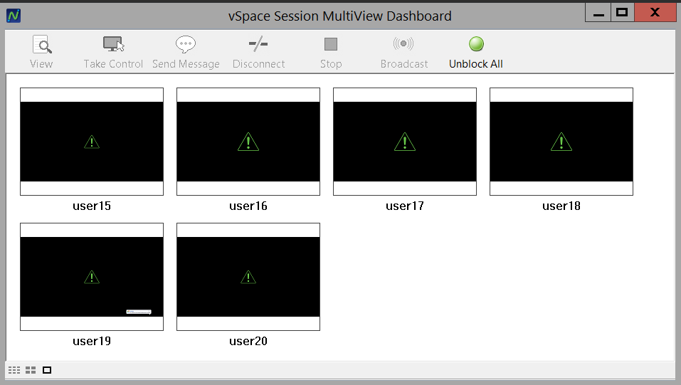 The vSpace Session Multiview Dashboard, a popular feature from vSpace 8, is back in vSpace Pro 11. This MultiView Dashboard provides a dashboard of active session thumbnails, allowing a lead user to message other users, take control of their ...