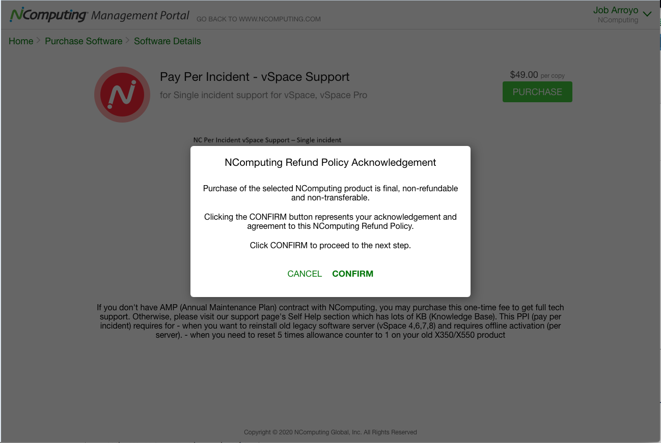 For this example, let's assume that you have an open ticket with support and you need to speak with them regarding your vSpace installation. In such case, you will click on the "Pay Per Incident - vSpace Support".