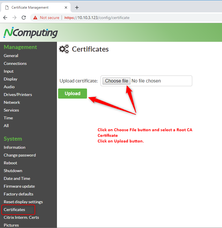 Certificates can be directly uploaded to the device, without using NoTouch Center. To do that follow the below mentioned steps: